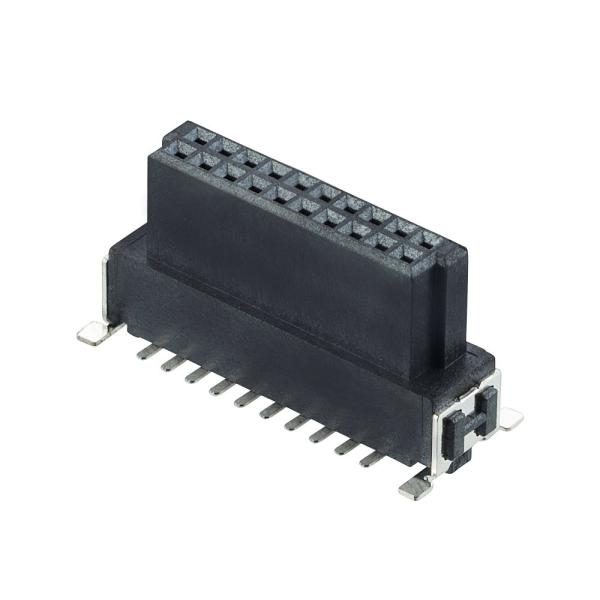 .The socket connectors are twin-beam female contacts, and these mate to solid pin male connectors. All board mount connectors are double row and Surface Mount, supplied in tape-and reel packaging (pick-and-place caps included when applicable). All connector housings include location pegs for additional placement assistance on the PCB, and SMT side tabs for additional peel strength and strain relief when soldered down.